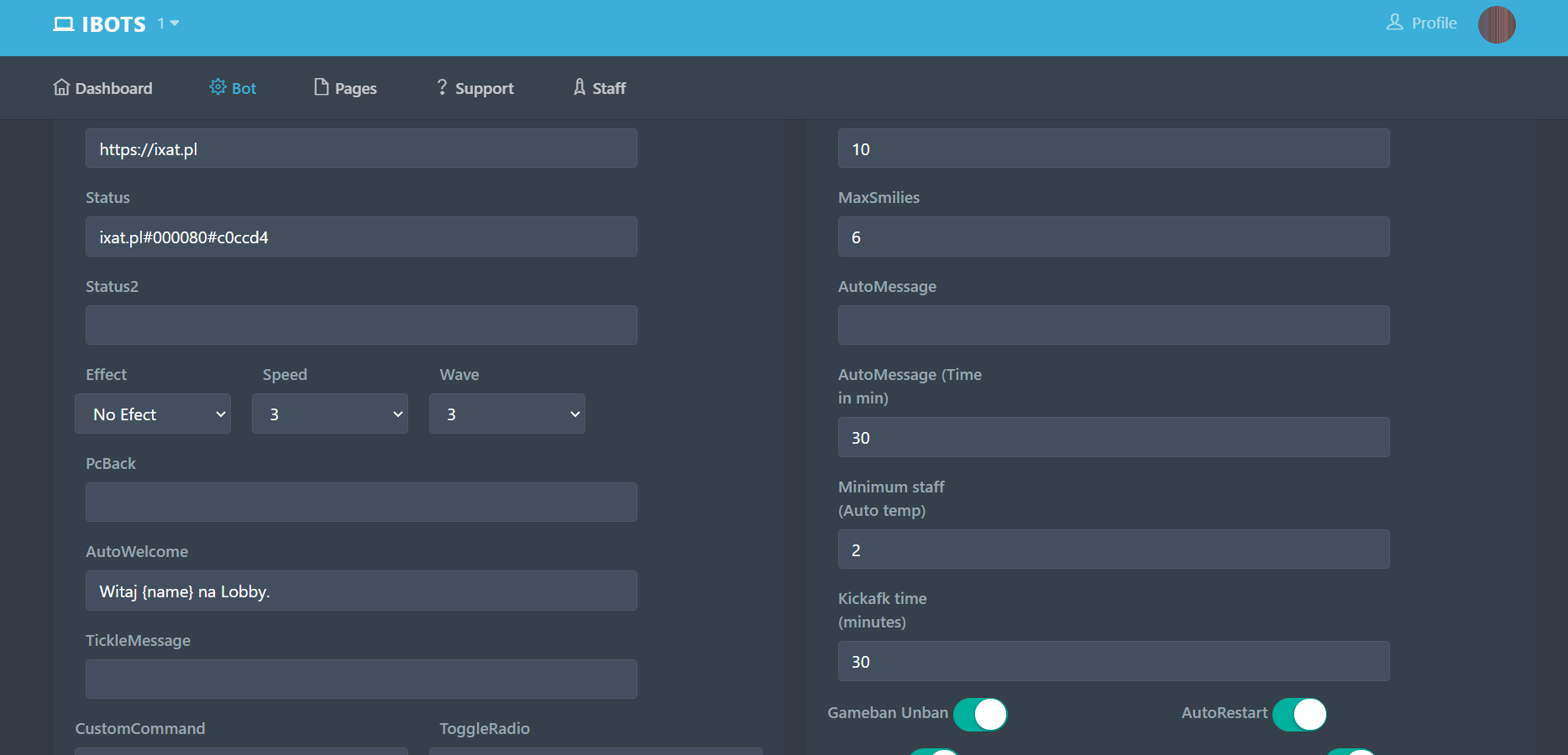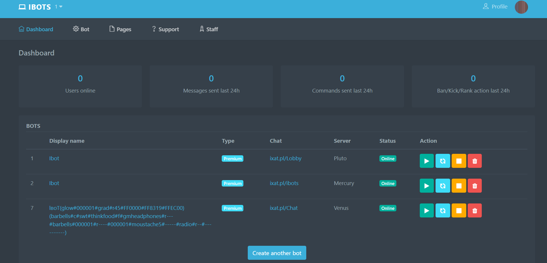 Assign the power bot to your chat and set it up in your chat settings with the xat ID 108. Then register on our site, click "Create a bot" and use the menu functions on the top of the website to customize your bot. Finally, when you are done creating your bot, go back to the dashboard and then start your bot!